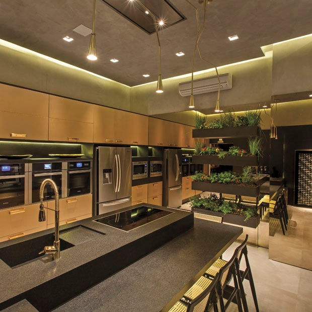 Apostando no dourado e no preto, Caroline Sautchuck criou um ambiente marcado por luxo e sofisticação. A madeira e o granito associados a criação de uma horta vertical, proporciona conforto, frescor e a possibilidade de temperos fresquinhos a qualquer hora. Do luxo do dourado ao conforto do verde com a madeira, encontramos equilíbrio nesta cozinha incrível projetada pela designer de interiores.